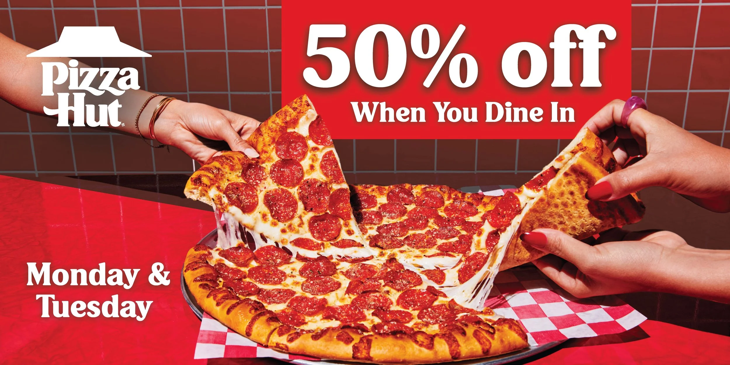 Dine in only. Cannot be combined with any other coupons, discounts, offers, or promotions. Valid only at participating Pizza Hut locations. Excludes alcohol sales. See locations below for details.